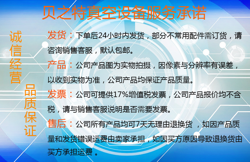 3:真空泵/真空系统:保修12个月;在不关乎真空装置组装与加工的基本技术,其他日常维护和维修的前提下,我公司提供免费的技术支持。